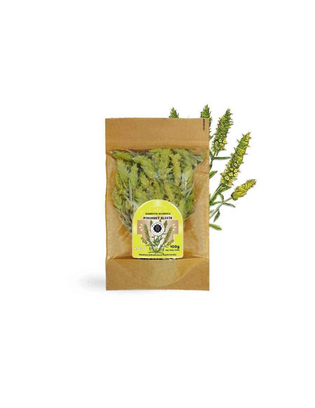 Pirinský elixír, jehož jedinou složkou je blahodárná bylina z balkánských hor, u nás nesoucí botanický název Hojník horský a je též známá pod názvy Zlatý čaj, Řecký horský čaj, Syrský horský čaj, Krétský čaj, Mursalský čaj a další. My jsem jej nazvali jménem bulharských hor, ve kterých byl vypěstován a pro účastníky legendárních seminářů s Petrem Chobotem v Pirinu přináší tak název kouzlo krásných vzpomínek na magická místa a zážitky z Pirinských hor. Podle vzpomínek Petra Chobota také víme, že hojník horský - latinsky názvem Sideritis (ten kdo má železo) , byla oblíbená bylina jasnovidky Vangy, která tuto bylinu ráda používala. Od Petra také víme, že bylina, kromě mnoha užitečných vlastností, (které zde nemůžeme podle platné legislativy uvádět), byla to posvátná bylina Bogomilců a má harmonizující účinky a působí vysokovibračně na lidského ducha. A už samotná její lahodná chuť pozvedá náladu člověka.