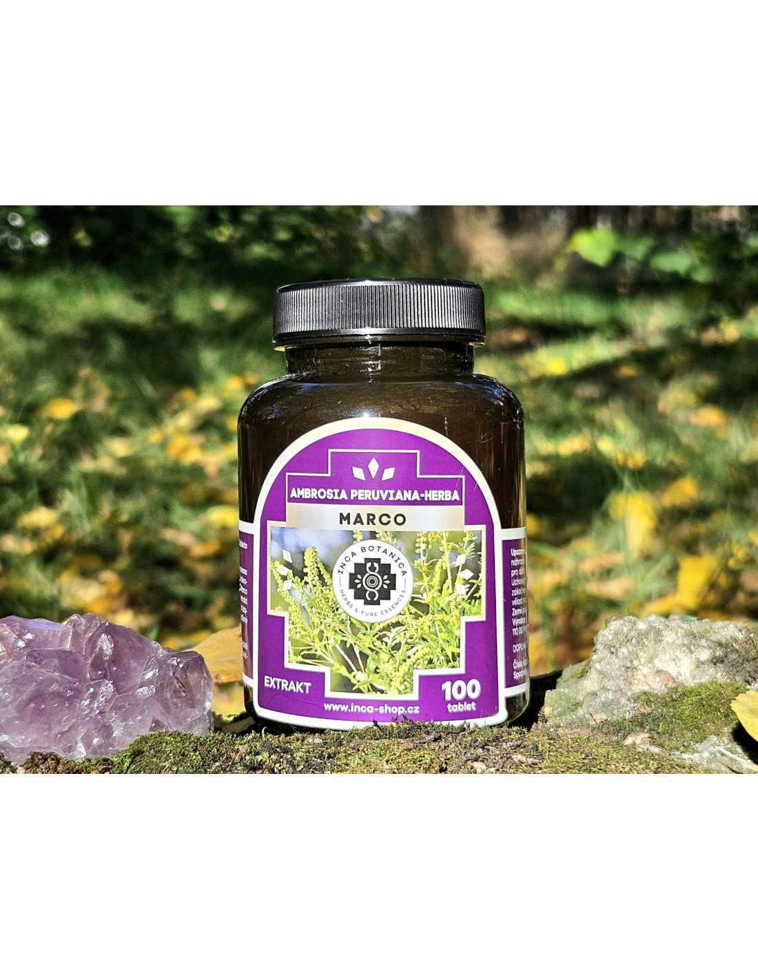 Marco (Ambrosia peruviana, česky ambrozie peruánská) je bylina, která roste v horských oblastech Peru a má dlouhou tradici využití v místní etnomedicíně. Již po staletí je považována za rostlinu s očistnými, posilujícími a harmonizujícími účinky, která slouží k podpoře celkové rovnováhy těla i mysli.